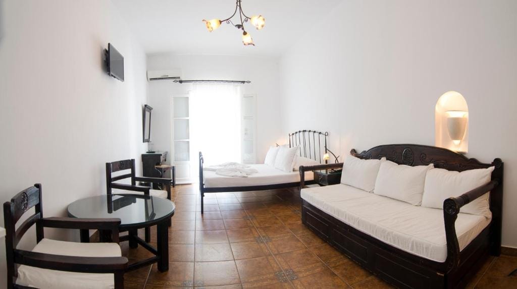 Chambres spacieuses et lumineuses avec balcon et vue partielle sur la mer Égée.